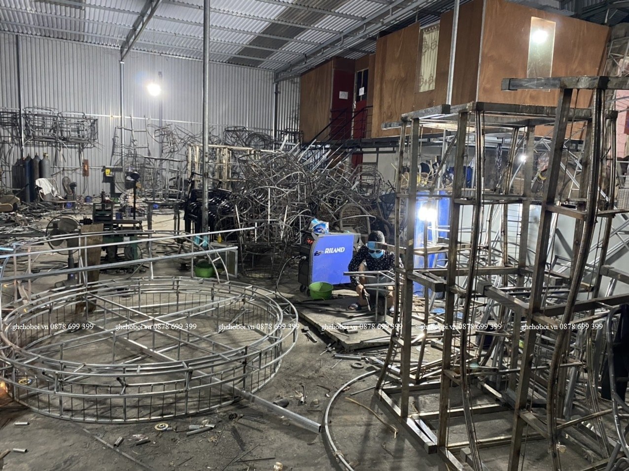- Gia công cơ khí Các ống kim loại được nhập về dựa trên số lượng sản phẩm sản xuất. Chúng sẽ được phân cho một tổ nhân công ở xưởng cơ khí. Họ phân ra từng công đoạn thực hiện khác nhau: cắt, uốn, hàn định hình, hàn kín, mài nhẵn.