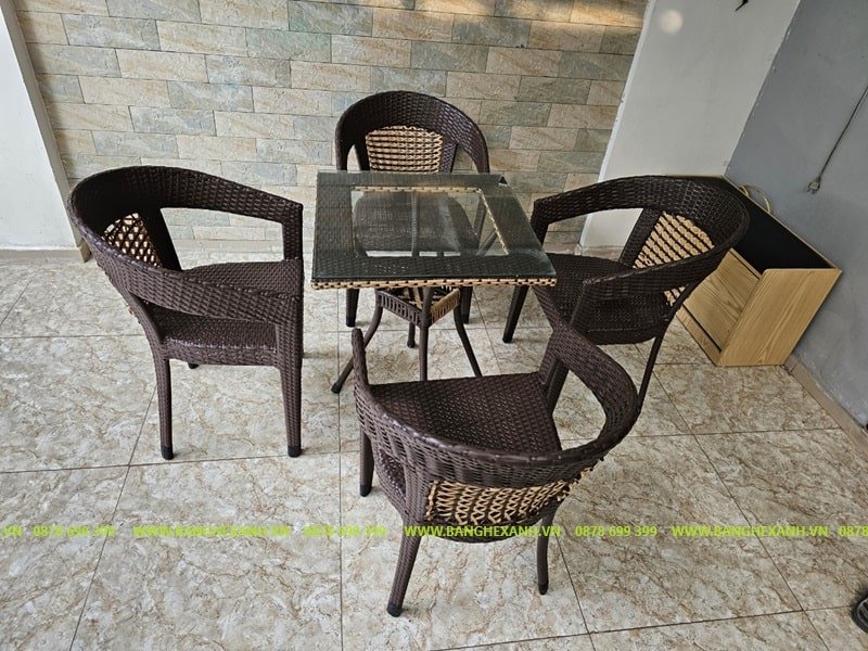 Giá bán: Giá bán cho bộ phẩm Bàn Ghế Cafe Mây Nhựa TL012 gồm 4 ghế và 1 bàn, ghế không bao gồm đệm, bàn đã bao gồm kính an toàn 8mm.