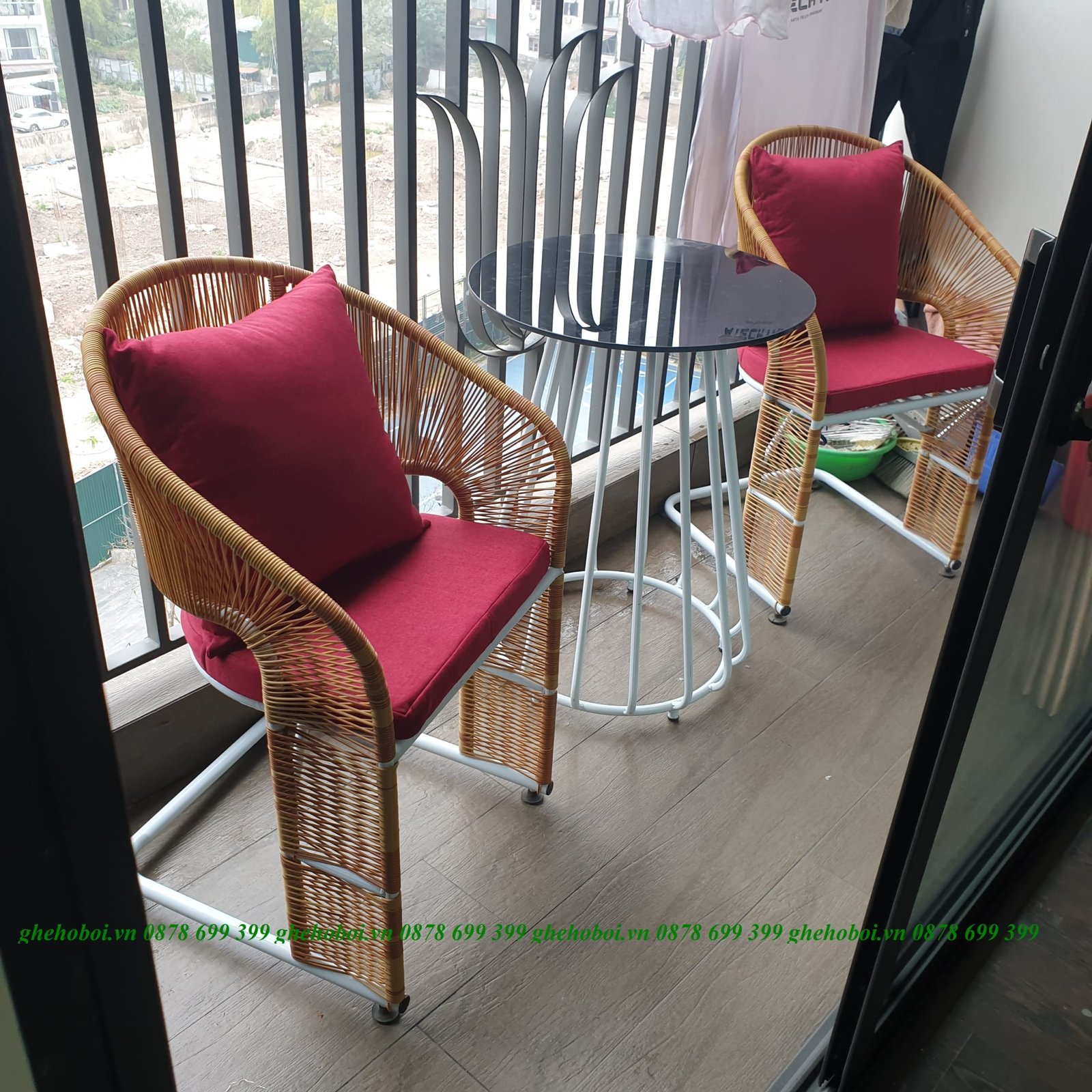 Khung bằng ống thép mạ kẽm hoặc sơn tĩnh điện, kết hợp đan sợi mây nhựa cao cấp 100% hạt nhựa nguyên sinh, có phụ gia chống tia UV, bảo vệ sức khỏe và môi trường. Chịu được thời tiết nắng mưa, thích hợp khi để ngoài trời, ban công, sân vườn và trong nhà.