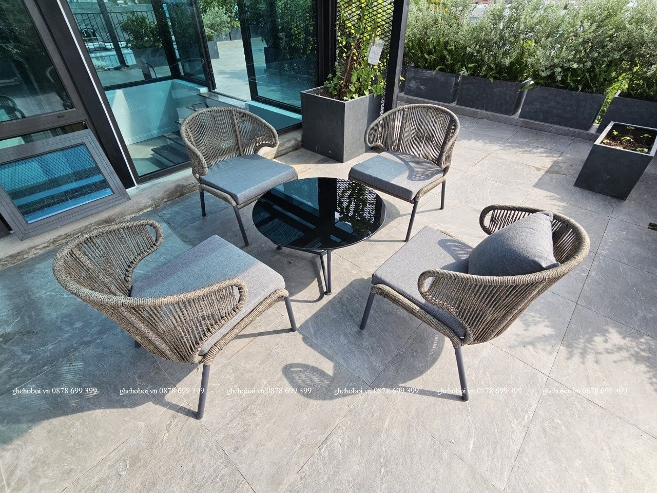 Giá bán:  Giá bán cho bộ sản phẩm gồm 4 ghế 1 bàn, ghế đã bao gồm đệm và gối bàn đã bao gồm kính cường lực 10mm.