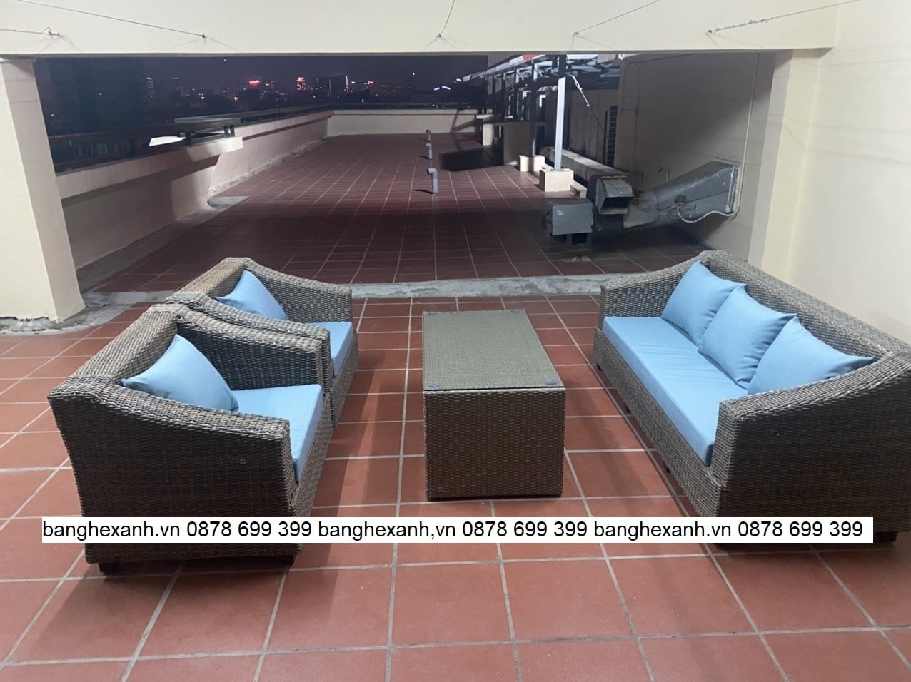 Giá bán:  Giá bán cho bộ sản phẩm gồm 1 ghế băng ba, 2 ghế đơn, 1 bàn đã bao gồm kính, không bao gồm đệm và gối.