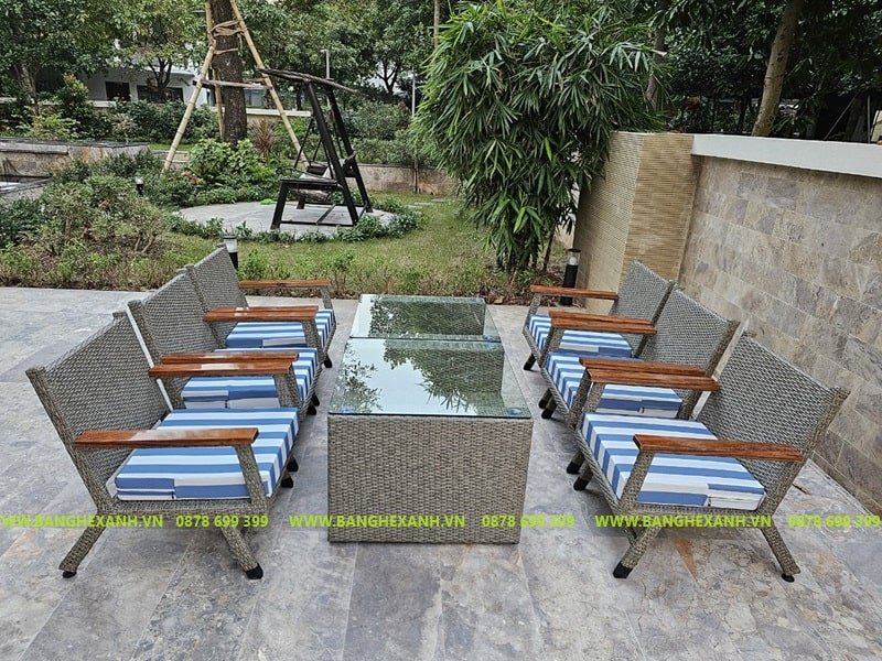 Chất liệu: Khung sắt, sơn tĩnh điện, đan sợi mây nhựa nguyên chất dẹt 7mm VNXK kèm phụ gia kháng tia UV, kết hợp tay ốp gỗ Teak vô cùng bắt mắt và chắc chắn.